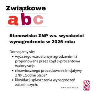 10 lutego 2026 r. Prezydium ZG ZNP przyjęło Stanowisko wobec proponowanych zmian wysokości wynagrodzenia zasadniczego nauczycieli w roku 2026. Domagamy się: Stanowisko Prezydium ZG ZNP wobec…