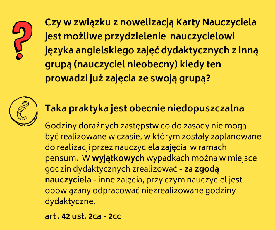 Niedopuszczalne jest przydzielenie doraźnego zastępstwa w ten sposób, że nauczyciel miałby prowadzić zajęcia jednocześnie w dwóch grupach – w jednej w ramach pensum, a w